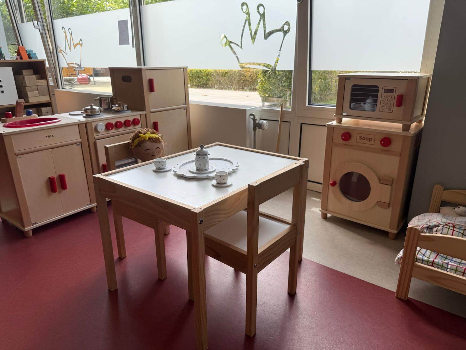 De gezellige speelhoeken nodigen uit tot bouwen, knutselen, fantaseren en rollenspel. Binnen een herkenbaar dagritme wisselen we vrij spel af met samen activiteiten doen, eten en buiten spelen. Zo ervaren kinderen structuur, veiligheid en volop plezier.